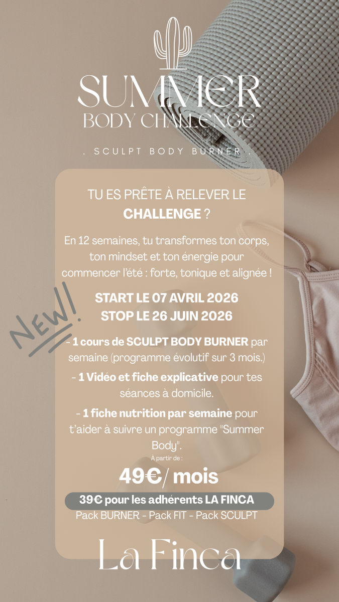Le Summer Body Challenge de La Finca est un programme complet de transformation qui combine fitness, pilates, EMS, nutrition et motivation collective pour t’accompagner pas à pas vers une meilleure forme physique.