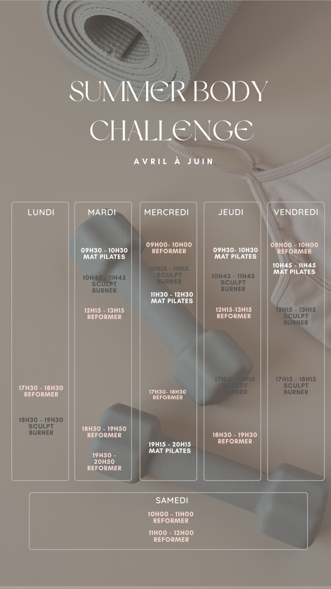 1 séance de Sculpt Body Burner + séances de Mat Pilates selon les semaines.